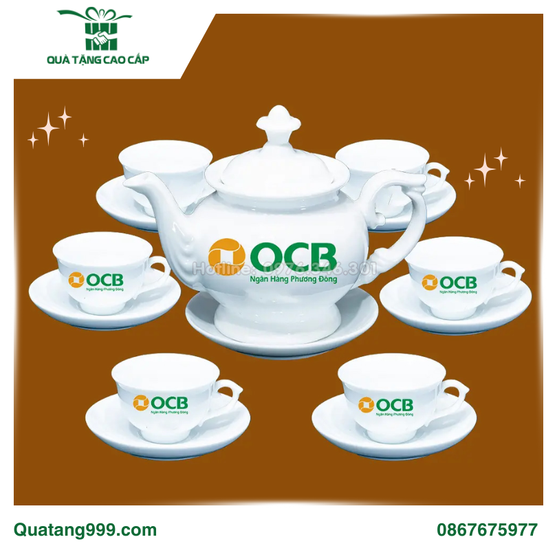 Khác biệt hoàn toàn với những sản phẩm đại trà, bộ ấm chén tại Quatang999.com được tuyển chọn từ cốt đất cao lanh lọc kỹ không tạp chất, nung ở nhiệt độ khử 1.300 độ C để tạo ra lớp xương gốm đanh chắc, tiếng gõ vang như chuông và tuyệt đối an toàn cho sức khỏe. Trên nền men ngọc trong veo ấy, logo thương hiệu của bạn không chỉ đơn thuần là in lên, mà được các nghệ nhân sử dụng kỹ thuật nung decal trượt nước hoặc vẽ tay bằng vàng kim 24K. Qua quá trình hấp nhiệt lần hai, các phân tử vàng và mực in tiệp sâu vào lớp men, đảm bảo logo sáng bóng vĩnh cửu, không bao giờ bong tróc dù trải qua hàng ngàn lần rửa.